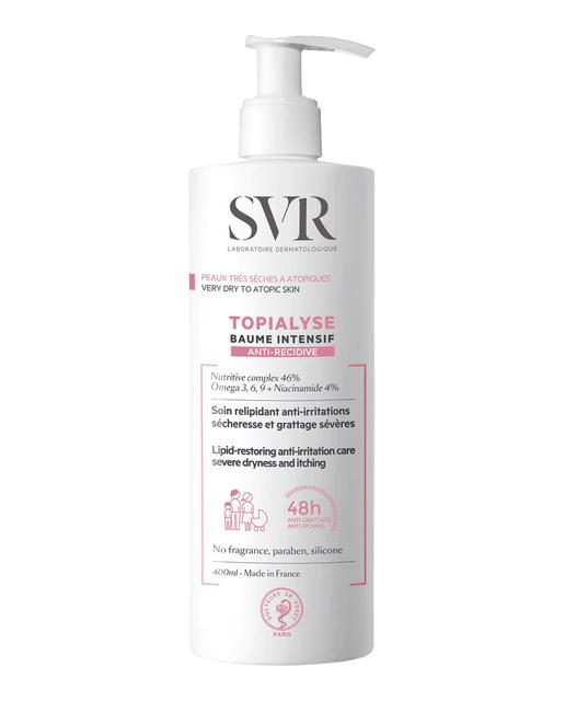 El Bálsamo relipidante pieles atópicas Topialyse SVR está formulado para el tratamiento de antiirritaciones, sequedad y picor severo en pieles muy secas, irritadas o con tendencia atópica. Su acción se extiende durante 48 horas. Este producto contiene un 46% de fase emoliente, que incluye ceramidas omega 3, 6 y 9, lo que ayuda a restaurar, reestructurar y reforzar la función barrera de la piel. Además, incorpora niacinamida, que proporciona una acción calmante y antiirritaciones, y un azúcar prebiótico que reequilibra la flora cutánea.